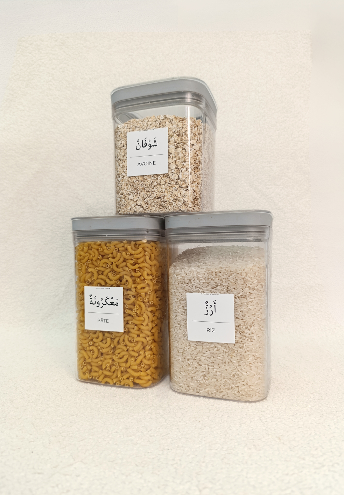 Apportez une touche authentique et raffinée à votre cuisine en utilisant nos étiquettes en arabe pour vos bocaux et récipients. En plus d’organiser votre garde-manger, elles offrent à toute la famille une belle opportunité d'apprendre l'Arabe, tout en mettant en valeur votre identité arabo-musulmane.