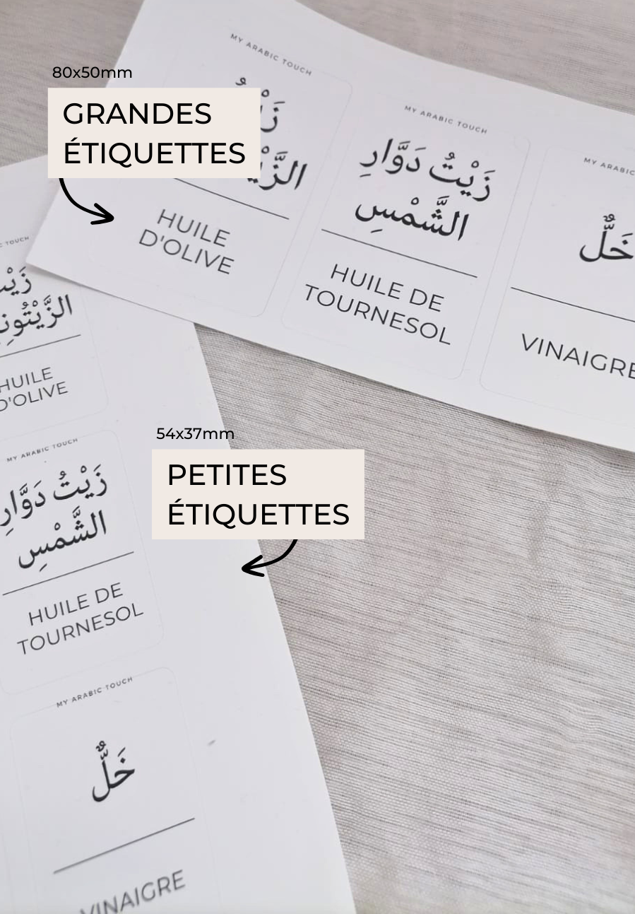 Chaque étiquette présente une inscription en français et en arabe, pour faciliter l'apprentissage de la langue arabe tout en cuisinant. Elles sont conçues pour être facilement lisibles et compréhensibles, pour que vous puissiez identifier rapidement et facilement vos condiments préférés.