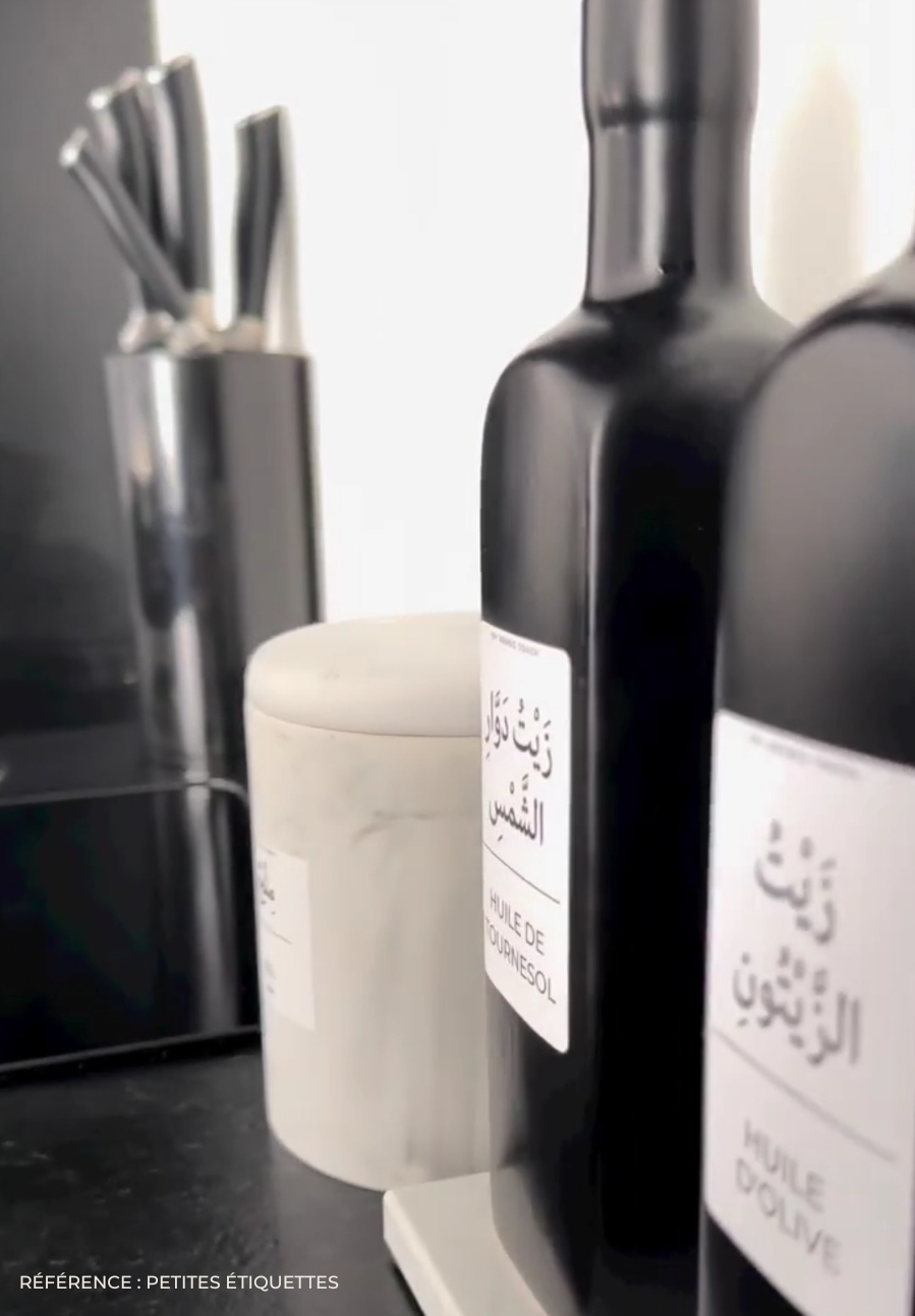 Sublimez votre plan de travail avec nos étiquettes d'huiles et vinaigre, et offrez vous une opportunité d'apprendre la langue arabe tout en cuisinant.