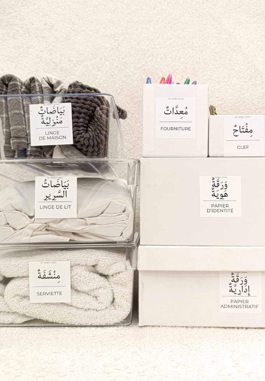 Apprenez l'arabe de manière simple et spontanée en associant chaque objet à son nom en arabe, tout en améliorant l'aspect visuel et fonctionnel de vos espaces de rangement.